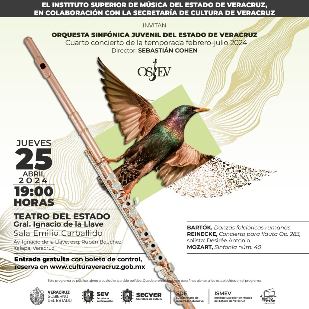 El concierto se llevará a cabo el jueves 25 de abril del 2024 en la Sala Emilio Carballido a las 19:00 horas en el Teatro del Estado «Gral. Ignacio de la Llave». La orquesta ofrecerá una experiencia que llevará disfrutar de las melodías de Bartók, Reinecke y Mozart.