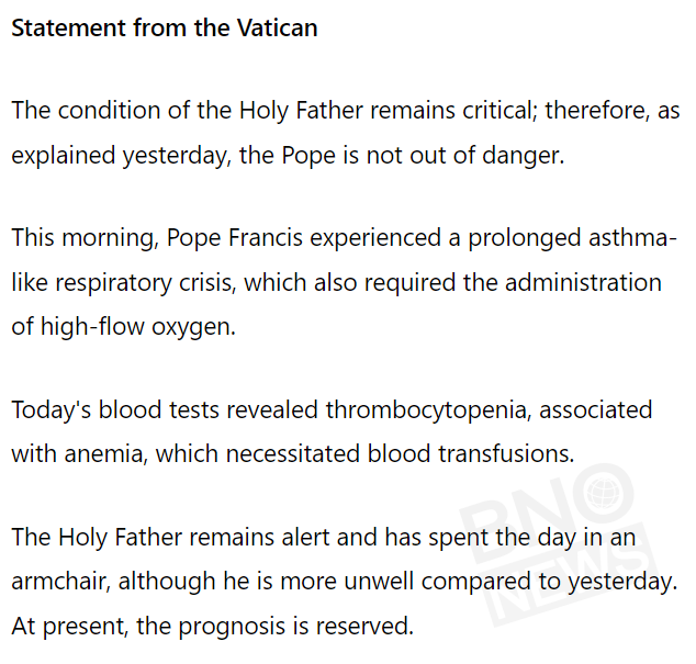 “El Santo Padre continúa alerta y ha pasado el día en un sillón aunque con más dolor que ayer. Por el momento el pronóstico es reservado”, dice el comunicado.