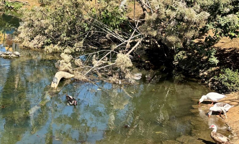 Durante un recorrido en la zona se observó a la mujer paseando a sus tres perros a la orilla del lago de Las Ánimas, mientras los patos y gansos chapoteaban entre los desechos y las tortugas asomaban la cabeza y su caparazón entre la basura y la contaminación del cuerpo de agua.