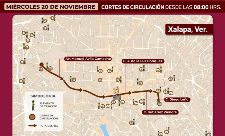 Xalapa, Ver.- Este miércoles se llevarán a cabo 35 cortes a la circulación sobre la avenida Manuel Ávila Camacho y zona centro de Xalapa con motivo del desfile cívico-militar conmemorativo al 114 Aniversario del inicio de la Revolución Mexicana.
