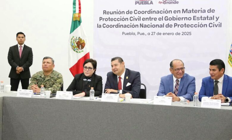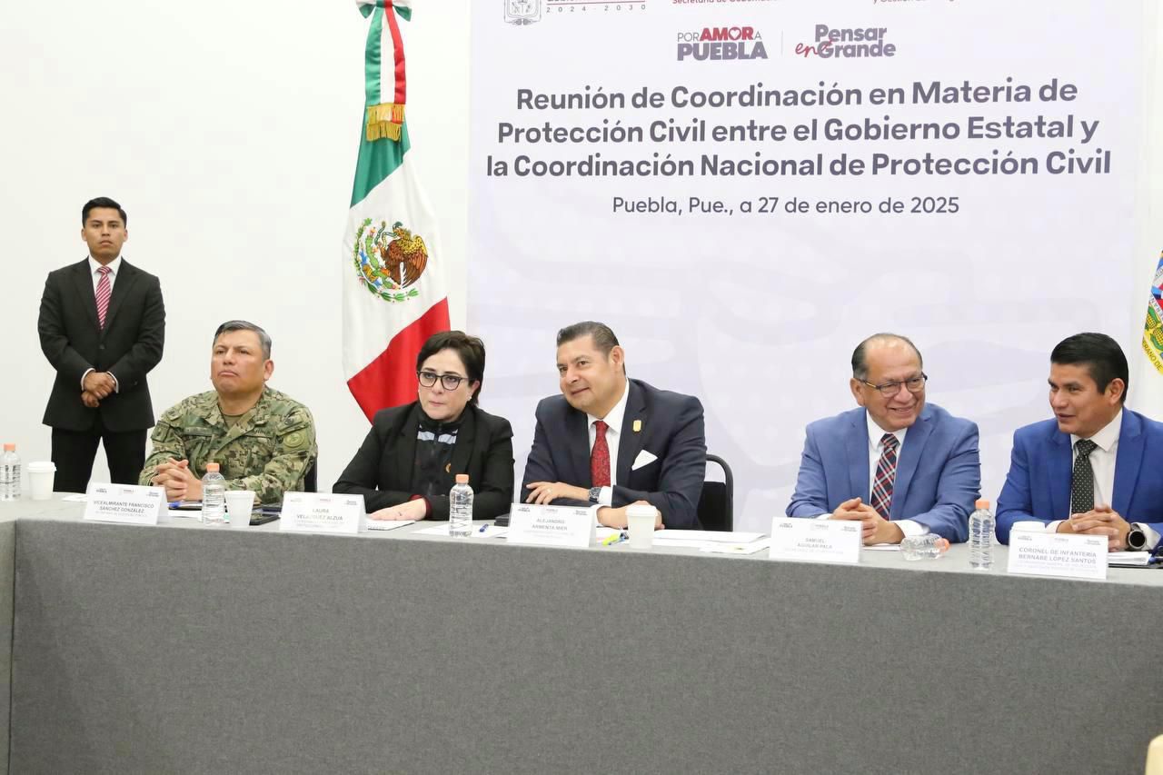 “Siguiendo la indicación de nuestra presidenta, todo el equipo trabaja en coordinación, tomamos la propuesta de agenda 2025, nos sumamos a la línea nacional”, afirmó el gobernador del Estado, Alejandro Armenta, durante la Reunión de Coordinación en materia de Protección Civil que encabezó junto a Laura Velázquez Alzúa, titular de la Coordinación Nacional de Protección Civil de la Secretaría de Seguridad y Protección Ciudadana federal.