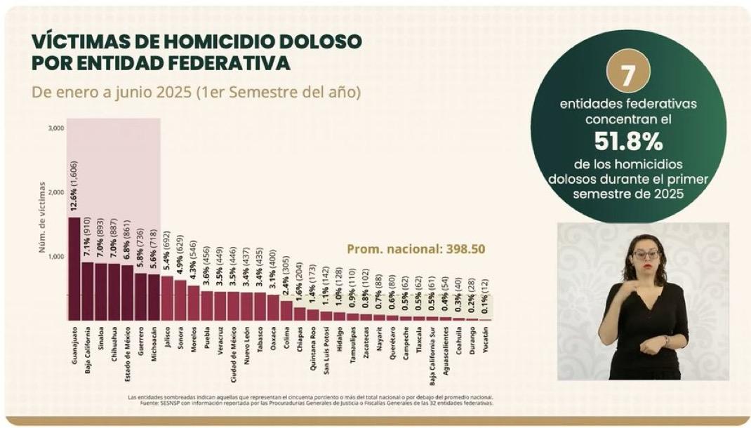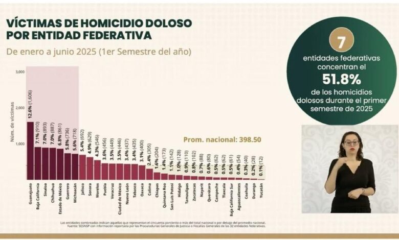 A renglón seguido, detalló que durante el primer semestre de 2025, también 7 entidades federativas concentraron el 51.8% de los homicidios dolosos ocurridos en el país: