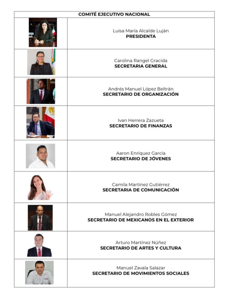 En más nombramientos, Ivan Herrera Zazueta, es el nuevo secretario de finanzas, Aaron Enríquez García, secretario de jóvenes; Camila Martínez Gutiérrez fue elegida secretaria de comunicación; Manuel Alejandro Robles Gómez sería el nuevo secretario de mexicanos en el exterior; Arturo Martínez Núñez será el nuevo titular de la secretaría de arte y cultura; en tanto Manuel Zavala Salazar; será en nuevo secretario de Movimiento Sociales.