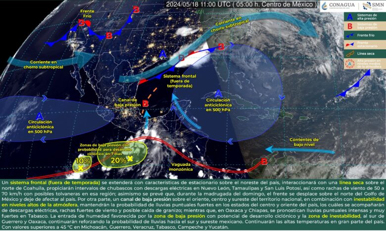 Para hoy, el sistema frontal (fuera de temporada) se extenderá con características de estacionario sobre el noreste del país, interaccionará con una línea seca sobre el norte de Coahuila, propiciarán intervalos de chubascos con descargas eléctricas en Nuevo León, Tamaulipas y San Luis Potosí, así como rachas de viento de 50 a 70 km/h con posibles tolvaneras en esa región; asimismo se prevé que, durante la madrugada del domingo, el frente se desplace sobre el norte del Golfo de México y deje de afectar al país. Por otra parte, un canal de baja presión sobre el oriente, centro y sureste del territorio nacional, en combinación con inestabilidad en niveles altos de la atmósfera, mantendrán la probabilidad de lluvias puntuales fuertes en los estados del centro y oriente del país, los cuáles se acompañarán de descargas eléctricas, rachas fuertes de viento y posible caída de granizo; mientras que, en Oaxaca y Chiapas, se pronostican lluvias puntuales intensas y muy fuertes en Tabasco. La entrada de humedad favorecida por la zona de baja presión con potencial de desarrollo ciclónico y la zona de inestabilidad, al sur de Guerrero y Oaxaca, continuarán reforzando la probabilidad de lluvias hacia el sur y sureste mexicano. Continuarán las altas temperaturas en gran parte del país. Con valores superiores a 45 °C en Michoacán, Guerrero, Veracruz, Tabasco, Campeche y Yucatán.