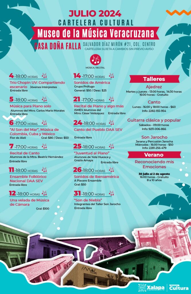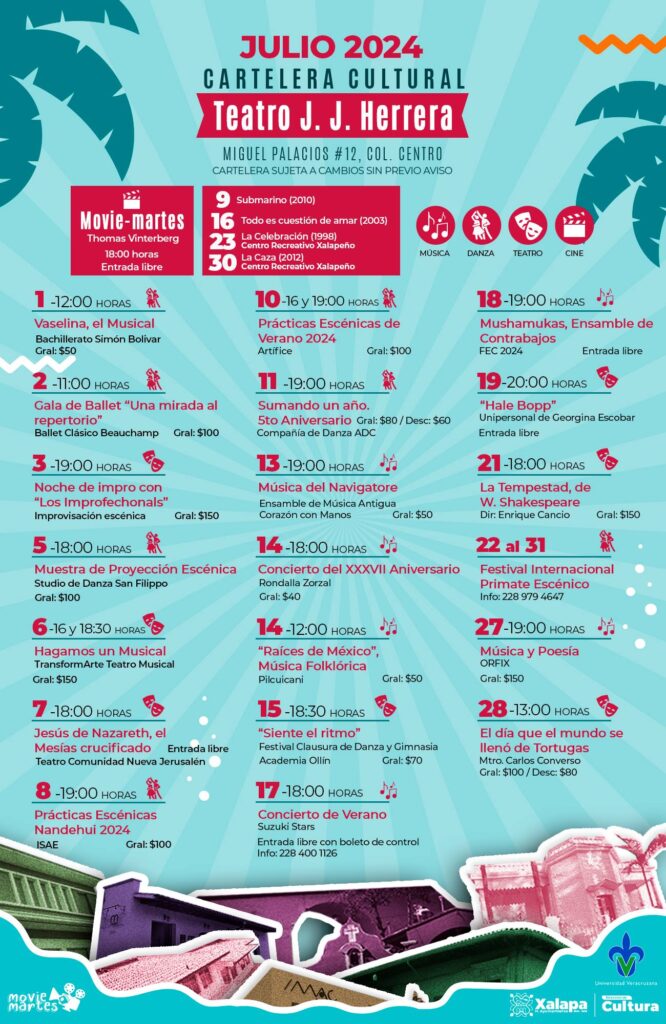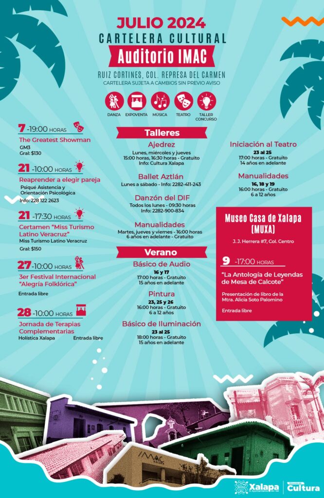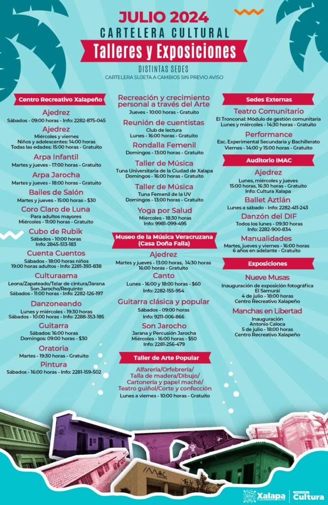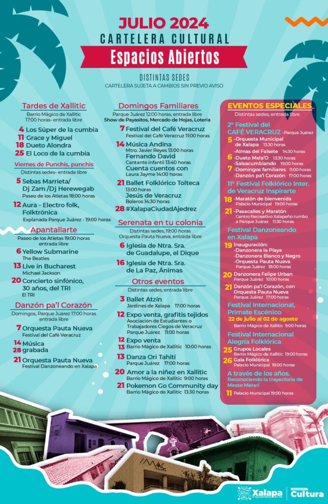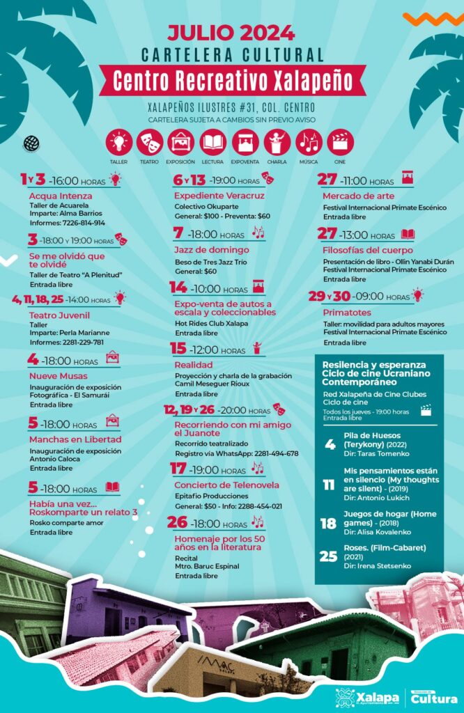 A través de la página Cultura Xalapa, el H. Ayuntamiento comunicó «Iniciamos el mes de julio con muchas actividades artísticas en todos nuestros recintos y Espacios Abiertos. También tenemos talleres para todos los gustos y todas las edades. Disfruta del teatro, cine, danza y conciertos. Checa la cartelera y arma tu itinerario».