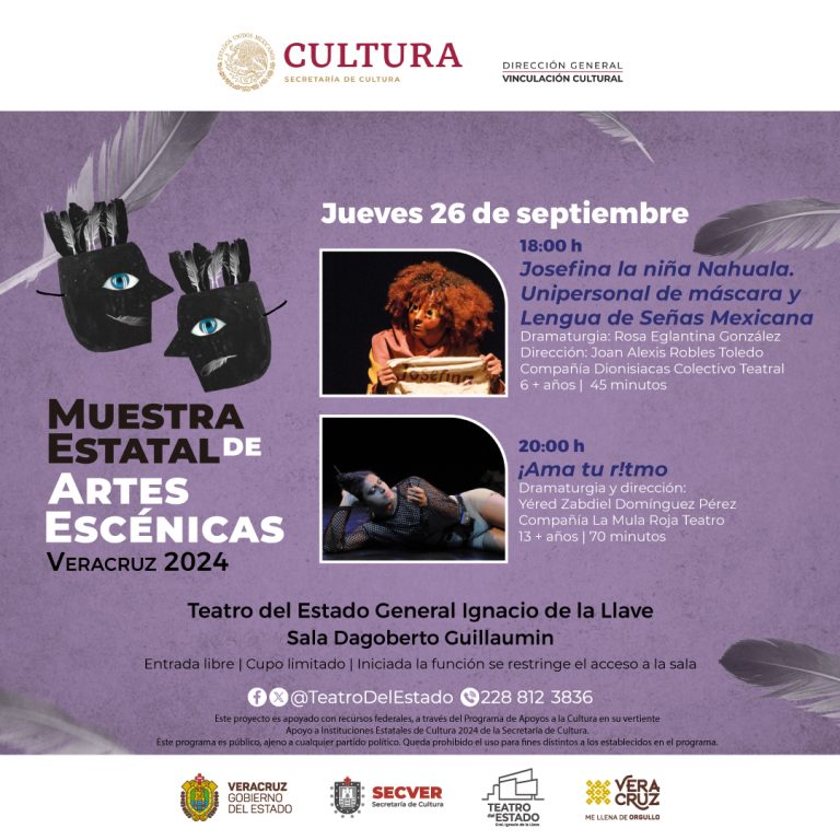 El jueves 26, en la Sala Dagoberto Guillaumin se presenta Josefina la niña Nahuala. Unipersonal de máscara y Lengua de Señas Mexicana, a cargo de Dionisiacas Colectivo Teatral, obra para toda la familia. Más tarde se presentará ¡Ama tu r!tmo de La Mula Roja Teatro, obra dirigida al público de 13 años en adelante.