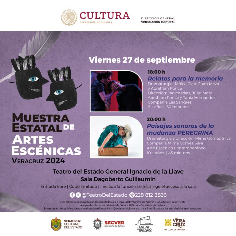 El viernes 27, Compañía Las Sangres presenta el proyecto Relatos para la memoria, dirigido a un público mayor de 6 años, posteriormente se podrá disfrutar el montaje Paisajes sonoros de la mudanza PEREGRINA de la Compañía Mirna Gómez Silva Arte Escénico Contemporáneo dirigido a un público de 10 años. Ambas puestas escénicas se llevarán a cabo en la Sala Dagoberto Guillaumin.