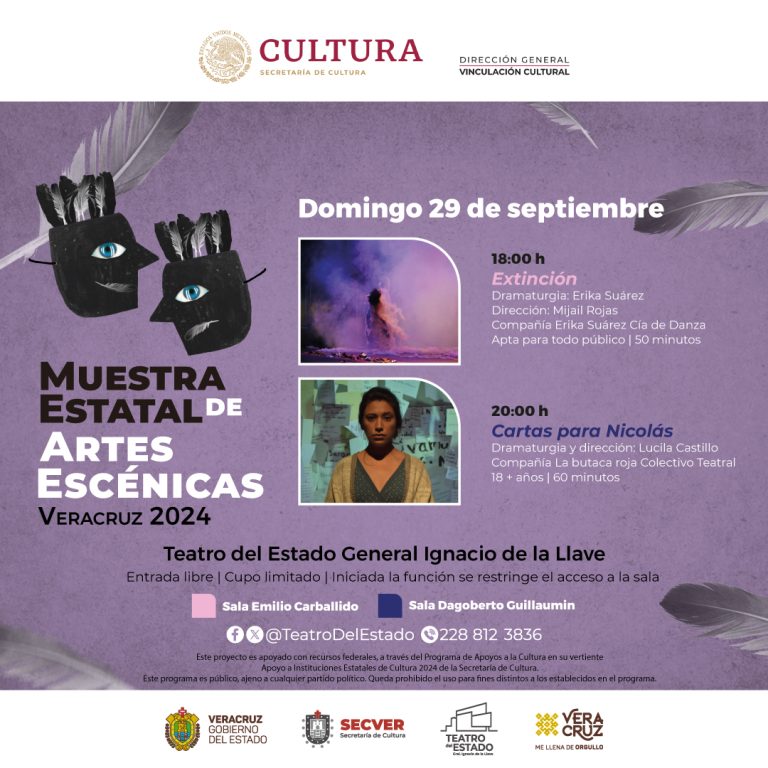 Finalmente, en la Sala Emilio Carballido, el domingo 29 a las 18:00 horas se presentará la puesta en escena Extinción de la compañía Erika Suárez Cía de Danza, obra para toda la familia. Mientras que en la Sala Dagoberto Guillaumin a las 20:00 horas, La butaca roja Colectivo Teatral presentará el proyecto teatral Cartas para Nicolás, dirigido a un público de 18 años en adelante.
