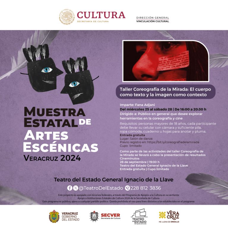 Del miércoles 25 al sábado 28, se llevará a cabo el taller Coreografía de la Mirada: El cuerpo como texto y la imagen como contexto dirigido al público en general que desee explorar herramientas en la coreografía y cine. Se requiere previo registro en el enlace Taller Coreografía de la Mirada así como llevar un teléfono celular con cámara y suficiente batería, ropa cómoda, cuaderno u hojas para anotar y pluma.