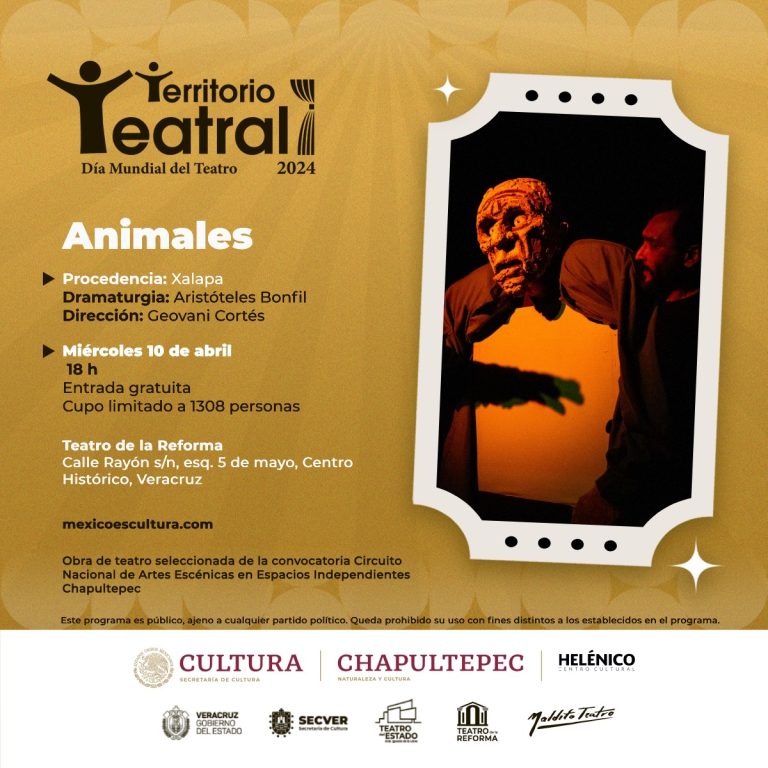 Y, en el puerto de Veracruz, en el Teatro de la Reforma, el miércoles 10 a las 18:00 horas se presentará la obra Animales de la compañía Maldito Teatro, dramaturgia de Aristóteles Bonfil y dirección de Geovani Cortés.