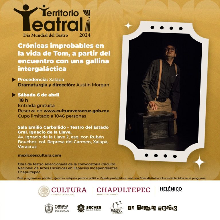 En el Teatro del Estado “Gral. Ignacio de la Llave”, el sábado 6 de abril a las 18:00 horas tendrá lugar la puesta en escena de Crónicas improbables en la vida de Tom, a partir del encuentro con una gallina intergaláctica, obra de «La Talacha Compañía de Teatro» con dramaturgia, dirección y actuación de Austin Morgan. Este unipersonal, enclavado entre lo fantástico y la ciencia ficción, está influenciado por el imaginario de los relatos de Bradbury en sus Crónicas marcianas.