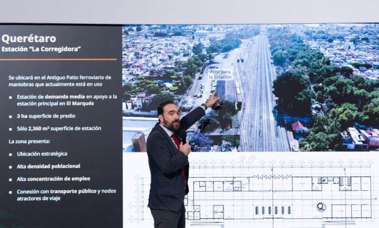 En Querétaro, precisó que la estación principal estará en El Marqués, mientras que la estación La Corregidora, ubicada en el centro histórico, aprovechará el antiguo patio ferroviario sin afectar el Parque Alcanfores.