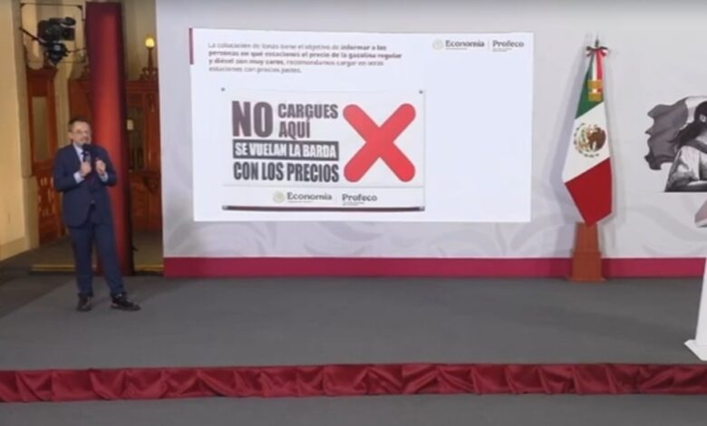 Durante el informe semanal “Quién es Quién en los Precios”, el titular de Profeco, Iván Escalante, anunció que a partir de esta semana se retomará la colocación de lonas con la advertencia “no cargues aquí”, dirigidas a señalar a las gasolineras que “se vuelan la barda” con los precios.