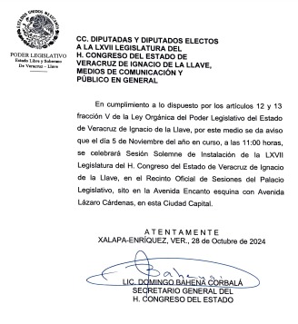 Por lo anterior, en cumplimiento con lo dispuesto por los artículos 12 y 13, fracción V, de la Ley Orgánica del Poder Legislativo del Estado de Veracruz, el Congreso convocará a la sesión solemne, a celebrarse este 5 de noviembre a partir de las 11:00 horas, para el inicio del periodo de la nueva Cámara.