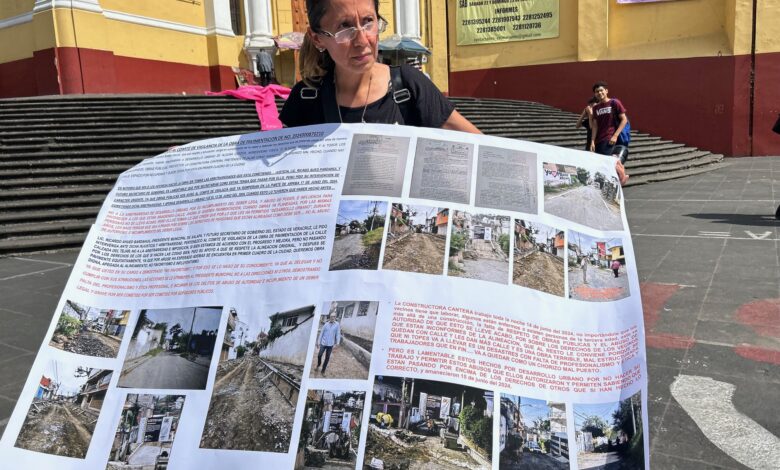 Juan David Castilla.- Una vecina de El Tejar, en esta ciudad de Xalapa, protestó frente a Palacio de Gobierno para denunciar presuntas anomalías en la obra de pavimentación de la calle Calzada del Tejar, cuyos trabajos iniciaron en mayo pasado.
