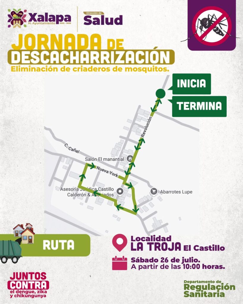 Xalapa, Ver.- Con el propósito de contribuir a prevenir enfermedades transmitidas por vectores como el dengue, el Ayuntamiento, a través de la Dirección de Salud, invita a vecinas y vecinos de la localidad La Troja, en la congregación El Castillo, a la jornada de descacharrización que se llevará a cabo en esta comunidad el próximo sábado.