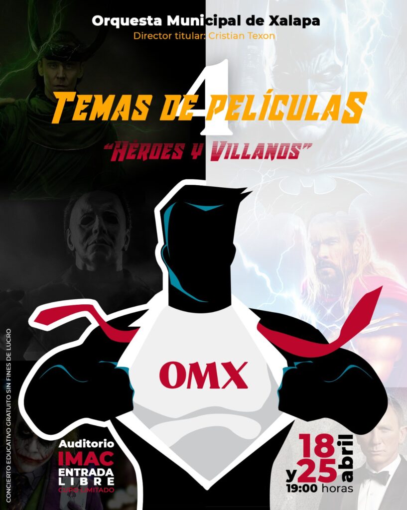 Regresa a la sala del auditorio el concierto de «Temas de películas» 4 donde «Héroes y villanos» estarán presentes a través de la música. Este se llevará a cabo este jueves 25 de abril a las 19:00 horas con entrada libre pero cupo limitado.