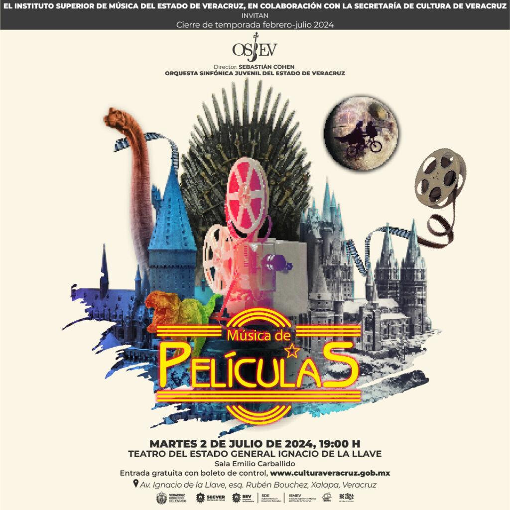 El concierto «Música de películas» estará a cargo de la Orquesta Sinfónica Juvenil Del Estado De Veracruz en dirección de Sebastián Cohen.