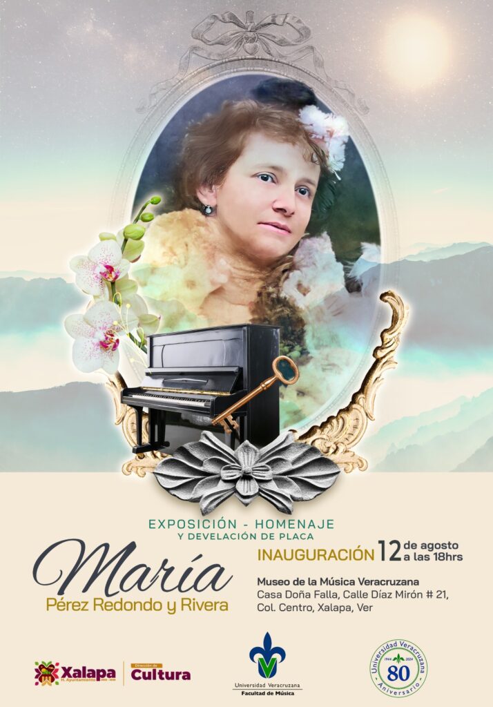 Se rendirá un homenaje-exposición y develación a la placa de la Maestra María Pérez Redondo y Rivera, pianista y compositora xalapeña, una de las pocas mujeres de su época que incursionaron en la composición de zarzuela.