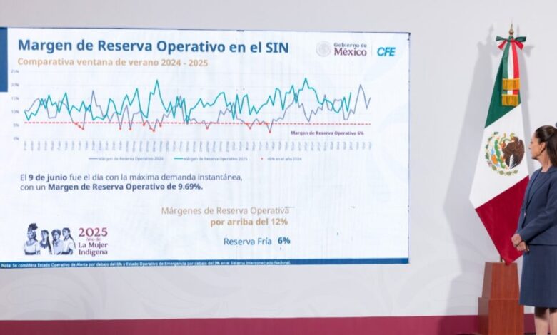 “Lo que se llama el Margen de Reserva —que es la cantidad de plantas que están en reserva por si sube la demanda— creció de 2024 a 2025, de 6 a 10 por ciento. ¿Por qué ocurrió eso? Pues por una mejor planeación, junto con el CENACE (Centro Nacional de Control de Energía), de: qué plantas entran, cuáles van a mantenimiento, etcétera. Segundo. Porque hay dos nuevas plantas de generación en el país, que fueron programadas desde el gobierno del Presidente López Obrador y que ya inauguramos, eso es lo segundo. Lo tercero, las nuevas plantas de generación solamente para 2025 a 2026.”