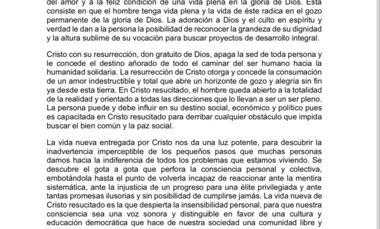 “La vida nueva de Cristo resucitado es la que despierta la insensibilidad personal, para que nuestra conciencia sea una voz sonora y distinguible en favor de una cultura y educación democrática que hace de nuestra sociedad una comunidad libre y llena de oportunidad”.