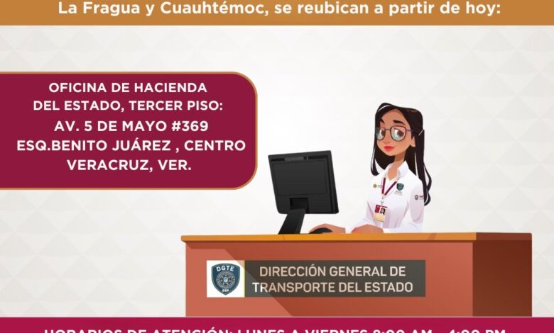 Veracruz, Ver., lunes 17 de febrero de 2025.- A partir de hoy, los módulos de licencia ubicados en las calles La Fragua y Cuauhtémoc han sido reubicados a una nueva sede en la Oficina de Hacienda del Estado, en el tercer piso del edificio ubicado en Av. 5 de Mayo #369, esquina Benito Juárez, en el centro de la ciudad.