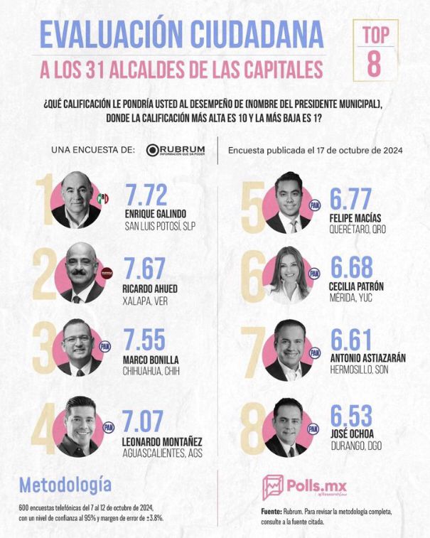 El estudio que se llevó a cabo del 7 al 12 de octubre evalúa el desempeño de los presidentes municipales, la percepción de los servicios públicos y la seguridad en las principales ciudades de México.