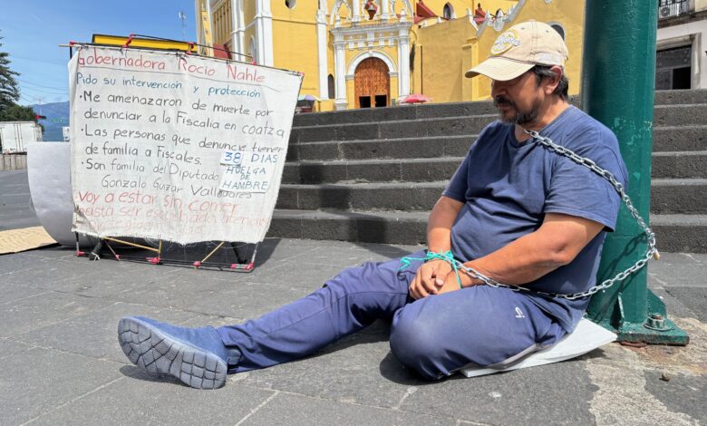 Juan Ricardo Ordóñez cumplió 38 días en huelga de hambre y este martes se encadenó a una luminaria de Plaza Sebastián Lerdo de Tejada, frente a Palacio de Gobierno, pues desde hace cuatro años presentó una denuncia por fraude en la compra de terrenos en Coatzacoalcos y a la fecha las investigaciones no avanzan.