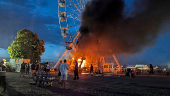 El hecho ocurrió durante la tarde del sábado 17 de agosto, mientras celebraran el Highfield Festival en el lago Stoermthaler, cerca de Leipzig. La atracción de 38 metros de altura se iluminó con el fuego ante los ojos de los asistentes.
