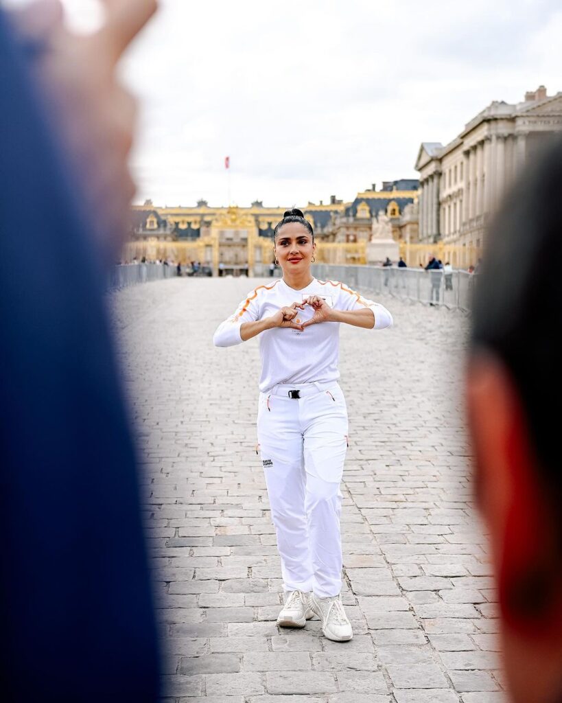 A través de redes sociales, la famosa compartió su emoción de representar a México y a los latinos, portando el fuego olímpico en donde relevó a la competidora ecuestre Laure Guilhaume en frente del Palacio de Versalles.