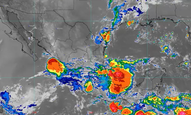 El pronóstico del tiempo para este lunes es de lluvias intensas (de 75 a 150 milímetros [mm]) en Guerrero, Oaxaca, Chiapas y el sur de Veracruz; muy fuertes (de 50 a 75 mm) en Zacatecas, Nayarit, Jalisco, Colima, Guanajuato, Puebla y Estado de México; fuertes (de 25 a 50 mm) en Sinaloa, Coahuila, Nuevo León, Durango, San Luis Potosí, Aguascalientes, Querétaro, Hidalgo, Tlaxcala, Morelos, Ciudad de México, Tamaulipas y Tabasco; chubascos (de 5 a 25 mm) en Chihuahua, Campeche, Yucatán y Quintana Roo,
