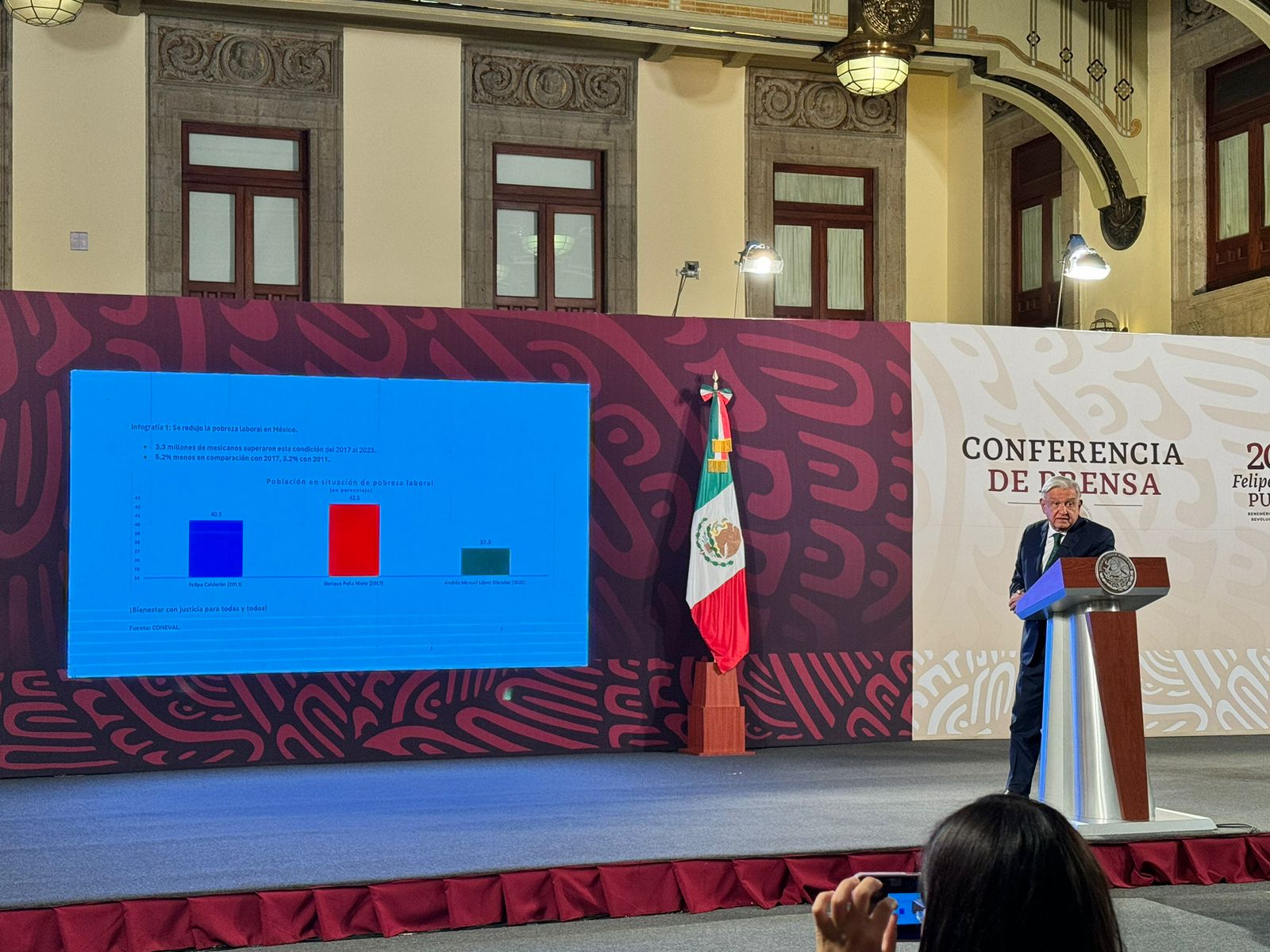 “Según datos del Consejo Nacional de Evaluación (CONEVAL), se redujo la pobreza laboral en México, como no sucedía en muchísimos años, desde que se tiene registro, el porcentaje de la población con ingreso laboral inferior al costo de la canasta alimentaria disminuyó a 35.8%”