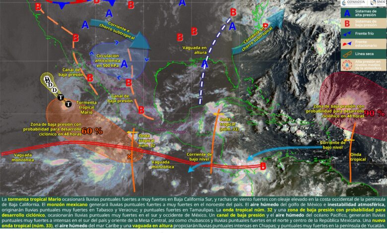 Para hoy, la tormenta tropical Mario se ubicará frente a la costa occidental de la península de Baja California y su circulación ocasionará lluvias puntuales muy fuertes en Baja California Sur, así como lluvias puntuales fuertes en Baja California, además de rachas de viento fuertes y oleaje elevado en la costa occidental de la península de Baja California. El monzón mexicano generará lluvias puntuales muy fuertes en Nayarit, Sinaloa, Durango y Chihuahua; y puntuales fuertes en Sonora. Por su parte, el ingreso de aire húmedo del golfo de México e inestabilidad atmosférica, originarán lluvias puntuales intensas en Tabasco y Veracruz; y puntuales fuertes en Tamaulipas. La onda tropical núm. 32 que se desplazará sobre el occidente de la República Mexicana, asociada con una zona de baja presión con probabilidad para desarrollo ciclónico, ocasionarán lluvias puntuales muy fuertes en Michoacán, Colima y Jalisco. Un canal de baja presión que se extenderá sobre el norte, centro y sur del territorio nacional y el ingreso de aire húmedo del océano Pacífico, ocasionarán lluvias puntuales intensas en Oaxaca; puntuales muy fuertes en Puebla y Guerrero; puntuales fuertes en Morelos, Ciudad de México, Estado de México y San Luis Potosí; así como chubascos en Tlaxcala, Hidalgo, Querétaro, Guanajuato, Aguascalientes, Zacatecas, Nuevo León y Coahuila. Una nueva onda tropical (núm. 33) se desplazará sobre la península de Yucatán y en combinación con la entrada de aire húmedo del mar Caribe y con una vaguada en altura situada al norte de dicha península, propiciarán lluvias puntuales intensas en Chiapas; y puntuales muy fuertes en Quintana Roo, Yucatán y Campeche. Finalmente, continuará el ambiente cálido a caluroso por la tarde en la mayor parte del territorio nacional, así como ambiente muy caluroso con temperaturas máximas mayores a 40 °C en zonas de Veracruz, Tabasco, Oaxaca y Chiapas.