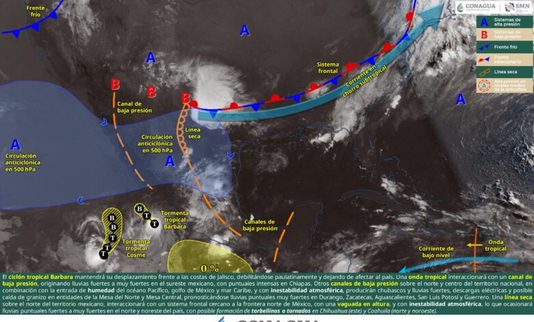 Para hoy, el ciclón tropical Barbara continuará su desplazamiento frente a las costas de Jalisco, debilitándose paulatinamente y dejando de afectar al país. Por otra parte, una onda tropical interaccionará con un canal de baja presión, originando lluvias fuertes a muy fuertes en el sureste mexicano, con puntuales intensas en Chiapas. Otros canales de baja presión sobre el norte y centro del territorio nacional, en combinación con la entrada de humedad del océano Pacífico, golfo de México y mar Caribe, y con inestabilidad atmosférica, producirán chubascos y lluvias fuertes, descargas eléctricas y posible caída de granizo en entidades de la Mesa del Norte y Mesa Central, pronosticándose lluvias puntuales muy fuertes en Durango, Zacatecas, Aguascalientes, San Luis Potosí y Guerrero. Una línea seca sobre el norte del territorio mexicano, interaccionará con un sistema frontal cerca de la frontera norte de México, con una vaguada en altura, y con inestabilidad atmosférica, lo que ocasionará lluvias puntuales fuertes a muy fuertes en el norte y noreste del país, con posible formación de torbellinos o tornados en Chihuahua (este) y Coahuila (norte y noroeste). Finalmente, una circulación anticiclónica en niveles medios de la atmósfera mantendrá el ambiente caluroso a muy caluroso en gran parte de la República Mexicana, prevaleciendo la onda de calor en Chihuahua (este y sureste), Coahuila (suroeste), Zacatecas (norte y sur), Durango (noreste y suroeste), Sinaloa (centro y sur), Nayarit (norte), Jalisco (centro y sureste), Michoacán (suroeste y sureste), Guerrero (centro y sur), Oaxaca (centro y sur), Veracruz (centro) y Campeche (noroeste y suroeste).