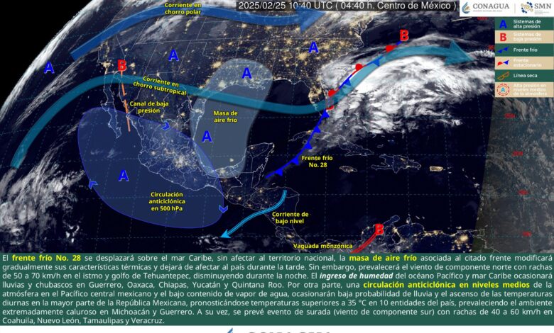 Para este día, el frente frío No. 28 se desplazará sobre el mar Caribe, sin afectar al territorio nacional, la masa de aire frío asociada al citado frente modificará gradualmente sus características térmicas y dejará de afectar al país durante la tarde. Sin embargo, prevalecerá el viento de componente norte con rachas de 50 a 70 km/h en el istmo y golfo de Tehuantepec, disminuyendo durante la noche. El ingreso de humedad del océano Pacífico y mar Caribe ocasionará lluvias y chubascos en Guerrero, Oaxaca, Chiapas, Yucatán y Quintana Roo. Por otra parte, una circulación anticiclónica en niveles medios de la atmósfera en el Pacífico central mexicano y el bajo contenido de vapor de agua, ocasionarán baja probabilidad de lluvia y el ascenso de las temperaturas diurnas en la mayor parte de la República Mexicana, pronosticándose temperaturas superiores a 35 °C en 10 entidades del país, prevaleciendo el ambiente extremadamente caluroso en Michoacán y Guerrero. A su vez, se prevé evento de surada (viento de componente sur) con rachas de 40 a 60 km/h en Coahuila, Nuevo León, Tamaulipas y Veracruz.