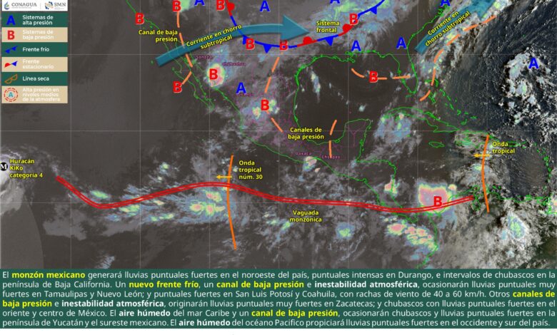Para hoy, el monzón mexicano generará lluvias puntuales intensas en Durango y puntuales fuertes en Nayarit, Sinaloa, Chihuahua y Sonora; y lluvias con intervalos de chubascos en Baja California y Baja California Sur, todas con descargas eléctricas. Un nuevo frente frío se aproximará a la frontera norte del país, en interacción con un canal de baja presión sobre el norte del territorio nacional y con inestabilidad atmosférica, ocasionará lluvias puntuales muy fuertes en Tamaulipas y Nuevo León; y puntuales fuertes en San Luis Potosí y Coahuila, acompañadas con descargas eléctricas y rachas de viento de 40 a 60 km/h. Otros canales de baja presión sobre el interior de la República Mexicana, en interacción con inestabilidad atmosférica, originarán lluvias puntuales muy fuertes en Zacatecas; puntuales fuertes en Veracruz, Puebla y Estado de México; y chubascos en Morelos, Ciudad de México, Tlaxcala, Hidalgo, Querétaro, Guanajuato y Aguascalientes. El flujo de aire húmedo del mar Caribe y un canal de baja presión sobre el sureste mexicano ocasionarán lluvias puntuales fuertes en Quintana Roo, Yucatán y Chiapas; y chubascos en Campeche y Tabasco. Asimismo, la entrada de aire húmedo del océano Pacifico propiciará lluvias puntuales fuertes en Oaxaca, Guerrero, Michoacán, Colima y Jalisco. Finalmente, continuará el ambiente cálido a caluroso por la tarde en zonas del norte y centro de la República Mexicana, litoral del Pacífico y del golfo de México, además de la península de Yucatán; así como ambiente muy caluroso con temperaturas máximas que podrían superar los 40 °C en zonas de Campeche y Yucatán.