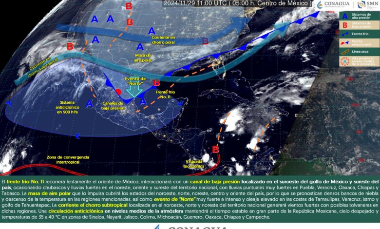 Para este día, el frente frío No. 11 recorrerá lentamente el oriente de México, interaccionará con un canal de baja presión localizado en el suroeste del golfo de México y sureste del país, ocasionando chubascos y lluvias fuertes en el noreste, oriente y sureste del territorio nacional, con lluvias puntuales muy fuertes en Puebla, Veracruz, Oaxaca, Chiapas y Tabasco. La masa de aire polar que lo impulsa cubrirá los estados del noroeste, norte, noreste, centro y oriente del país, por lo que se pronostican densos bancos de niebla y descenso de la temperatura en las regiones mencionadas, así como evento de “Norte” muy fuerte a intenso y oleaje elevado en las costas de Tamaulipas, Veracruz, istmo y golfo de Tehuantepec. A su vez, la corriente el chorro subtropical localizada en el noroeste, norte y noreste del territorio nacional generará vientos fuertes con posibles tolvaneras en dichas regiones. Finalmente, una circulación anticiclónica en niveles medios de la atmósfera mantendrá el tiempo estable en gran parte de la República Mexicana, cielo despejado y temperaturas de 35 a 40 °C en zonas de Sinaloa, Nayarit, Jalisco, Colima, Michoacán, Guerrero, Oaxaca, Chiapas y Campeche.