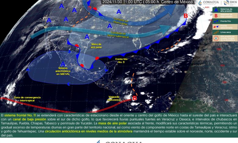 Para hoy, el sistema frontal No. 11 se extenderá con características de estacionario desde el oriente y centro del golfo de México hasta el sureste del país, interactuará con un canal de baja presión sobre el sur de dicho golfo, favorecerán lluvias puntuales fuertes en Veracruz y Oaxaca, así como intervalos de chubascos en Tamaulipas, Puebla, Chiapas, Tabasco y península de Yucatán. La masa de aire polar asociada al frente, modificará gradualmente sus características térmicas, permitiendo un gradual ascenso de temperaturas diurnas en gran parte del territorio nacional, así como viento de componente norte en costas de Tamaulipas y Veracruz, istmo y golfo de Tehuantepec. Una circulación anticiclónica en niveles medios de la atmósfera mantendrá el tiempo estable sobre el noroeste, norte, occidente y sur del país.