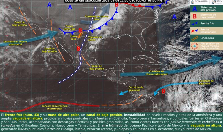 Hoy, el frente frío (núm. 43) y su masa de aire polar recorrerán el norte y noreste de México, interaccionarán con un canal de baja presión, además de inestabilidad en niveles medios y altos de la atmósfera y una amplia vaguada en altura, propiciarán lluvias puntuales muy fuertes en Coahuila, Nuevo León y Tamaulipas; lluvias puntuales fuertes en Chihuahua y San Luis Potosí, las lluvias estarán acompañadas de descargas eléctricas y posibles granizadas. Asimismo, se pronostican vientos fuertes y posible formación de torbellinos o tornados en Chihuahua, Coahuila, Nuevo León y Tamaulipas. Por otra parte, el ingreso de humedad, del océano Pacífico y golfo de México y los efectos de la vaguada en altura, propiciarán lluvias y chubascos en el occidente, sur y sureste del territorio nacional, con lluvias puntuales fuertes en Hidalgo, Puebla, Veracruz (centro) y Chiapas. Finalmente, prevalecerá la onda de calor en zonas de Jalisco (centro, sur y suroeste), Michoacán (centro y oeste), Guerrero (noroeste, centro y sur) y Oaxaca (centro, este y sureste).