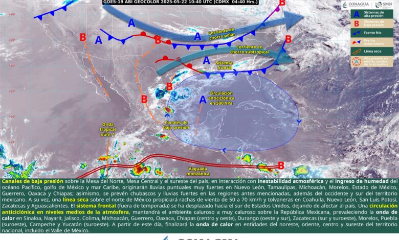 Mesa del Norte: Por la mañana, cielo parcialmente nublado y ambiente fresco a frío, siendo muy frío en sierras de Durango. Durante la tarde, cielo nublado con lluvias puntuales muy fuertes en Nuevo León y puntuales fuertes en Zacatecas, Aguascalientes y San Luis Potosí; las cualespodrían originar deslaves, encharcamientos e inundaciones, así como incrementar los niveles de ríos y arroyos; además de intervalos de chubascos en Coahuila y Durango, y lluvias aisladas en Chihuahua, todas con descargas eléctricas y posible caída de granizo; ambiente caluroso a muy caluroso, prevaleciendo la onda de calor en Durango (oeste y sur) y Zacatecas (sur y suroeste). Viento de dirección variable de 20 a 30 km/h con rachas de 50 a 70 km/h en zonas de Coahuila, Nuevo León, San Luis Potosí, Zacatecas y Aguascalientes.; y viento de 10 a 20 km/h con rachas de 30 a 50 km/h en el resto de la región, todas con posibles tolvaneras.
