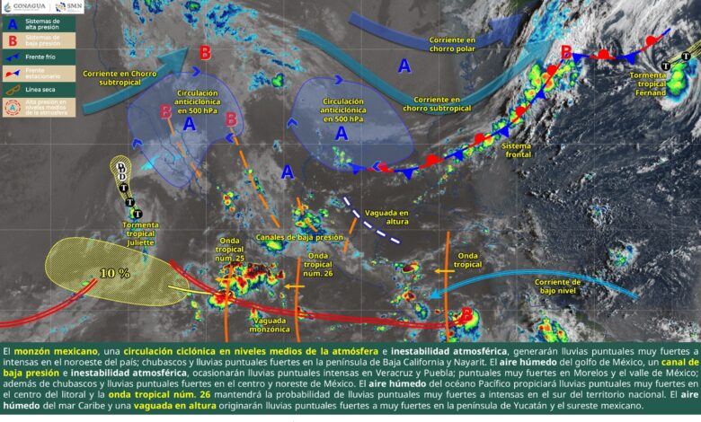 Para hoy, el monzón mexicano en interacción con una circulación ciclónica en niveles medios de la atmósfera sobre el sur del golfo de California y con inestabilidad atmosférica, generarán lluvias puntuales intensas en Sonora, Chihuahua y Sinaloa; muy fuertes en Durango; lluvias fuertes en Baja California Sur y Nayarit, y chubascos en Baja California. A su vez, la entrada de aire húmedo del golfo de México y un canal de baja presión sobre la Mesa del Norte y la Mesa Central, en combinación con inestabilidad atmosférica, ocasionarán lluvias puntuales intensas en Veracruz y Puebla; puntuales muy fuertes en Morelos, Ciudad de México y Estado de México; puntuales fuertes en Tlaxcala, Hidalgo, Querétaro, San Luis Potosí y Tamaulipas; e intervalos de chubascos en Guanajuato, Aguascalientes, Zacatecas, Nuevo León y Coahuila. El ingreso de aire húmedo del océano Pacífico propiciará lluvias puntuales muy fuertes en Jalisco, Colima y Michoacán; y el paso de la onda tropical núm. 26 sobre el sur del territorio nacional, mantendrá la probabilidad de lluvias puntuales intensas en Oaxaca; y puntuales muy fuertes en Guerrero. Por otra parte, el aire húmedo proveniente del mar Caribe y una vaguada en altura que se desplazará desde la península de Yucatán hasta el sureste mexicano, originará lluvias puntuales muy fuertes en Yucatán, Campeche y Chiapas; y puntuales fuertes en Quintana Roo y Tabasco. Finalmente, continuará el ambiente caluroso por la tarde sobre entidades del norte y centro de la República Mexicana, estados del litoral del Pacífico y del golfo de México, además de la península de Yucatán, llegando a ser muy caluroso con temperaturas de 40 a 45 °C en zonas de Baja California, Baja California Sur, Sonora, Michoacán y Guerrero. Asimismo, a partir de este día dará inicio una onda de calor en zonas de Jalisco, Colima, Michoacán, Guerrero y Oaxaca.