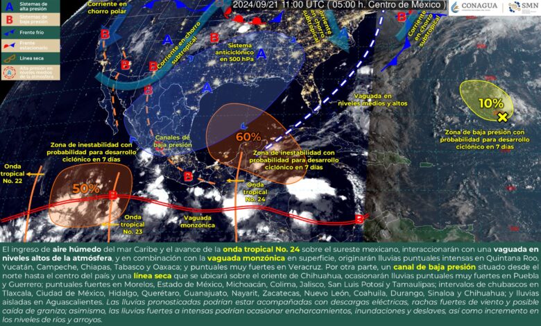 Para hoy, el ingreso de aire húmedo del mar Caribe y el avance de la onda tropical No. 24 sobre el sureste mexicano, interaccionarán con una vaguada en niveles altos de la atmósfera, y en combinación con la vaguada monzónica en superficie originarán lluvias puntuales intensas en Quintana Roo, Yucatán, Campeche, Chiapas, Tabasco y Oaxaca; y puntuales muy fuertes en Veracruz. A su vez, un canal de baja presión situado desde el norte hasta el centro del país y una línea seca que se ubicará sobre el oriente de Chihuahua, ocasionarán lluvias puntuales muy fuertes en Puebla y Guerrero; puntuales fuertes en Morelos, Estado de México, Michoacán, Colima, Jalisco, San Luis Potosí y Tamaulipas; intervalos de chubascos en Tlaxcala, Ciudad de México, Hidalgo, Querétaro, Guanajuato, Nayarit, Zacatecas, Nuevo León, Coahuila, Durango, Sinaloa y Chihuahua; y lluvias aisladas en Aguascalientes. Finalmente, se mantendrá el ambiente templado a cálido por la tarde en la mayor parte la República Mexicana, con temperaturas máximas calurosas superiores a 35 °C en zonas de Baja California, Sonora, Sinaloa, Chihuahua, Coahuila, Nuevo León, Tamaulipas, Tabasco, Campeche, Yucatán y Quintana Roo.