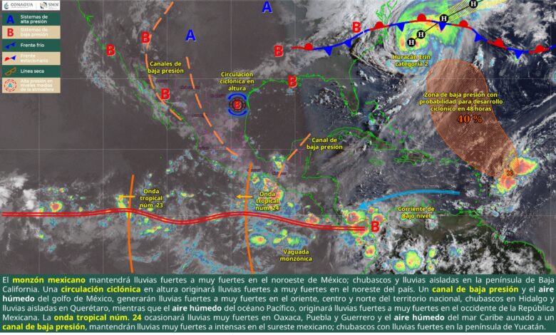 Para hoy, el monzón mexicano mantendrá la probabilidad de lluvias fuertes a puntuales muy fuertes en Nayarit y Sinaloa; puntuales fuertes en Durango, Chihuahua y Sonora; intervalos de chubascos en Baja California Sur; y lluvias aisladas en zonas de Baja California. Por su parte, una circulación ciclónica en altura que prevalecerá en el noreste del territorio nacional, originará lluvias puntuales muy fuertes en Tamaulipas y Coahuila; y puntuales fuertes en Nuevo León. Simultáneamente, un canal de baja presión que se extenderá sobre el norte y centro de México y el ingreso de aire húmedo del golfo de México, generarán lluvias puntuales muy fuertes en Veracruz y San Luis Potosí; puntuales fuertes en Tlaxcala, Morelos, Ciudad de México, Estado de México, Guanajuato, Aguascalientes y Zacatecas; chubascos en Hidalgo y lluvias aisladas en zonas de Querétaro, mientras que el flujo de aire húmedo del océano Pacífico, originará lluvias puntuales muy fuertes en Michoacán; y puntuales fuertes en Colima y Jalisco. A su vez, la onda tropical núm. 24 sobre el sur del país, ocasionará lluvias puntuales muy fuertes en Oaxaca, Puebla y Guerrero. La entrada de aire húmedo proveniente del mar Caribe y un canal de baja presión extendido desde la península de Yucatán hasta el sureste mexicano, mantendrá la probabilidad de lluvias puntuales intensas en Chiapas; puntuales muy fuertes en Tabasco; puntuales fuertes en Campeche e intervalos de chubascos en Quintana Roo y Yucatán. Finalmente, continuará el ambiente caluroso a muy caluroso por la tarde sobre la mayor parte de la República Mexicana, y muy caluroso en el norte del litoral de Pacífico y península de Baja California, con temperaturas máximas que podrán superar los 45 °C en el noreste de Baja California, oeste y noroeste de Sonora. Asimismo, prevalecerá la onda de calor en Baja California Sur.