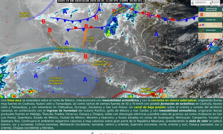 Para hoy, una línea seca se extenderá sobre el norte de México, interaccionará con inestabilidad atmosférica y con la corriente en chorro subtropical, originando lluvias muy fuertes en Coahuila, Nuevo León y Tamaulipas; así como rachas de vientos fuertes de 50 a 70 km/h con posible formación de torbellinos en Coahuila, Nuevo León y Tamaulipas, y con tolvaneras en Chihuahua, Durango, Zacatecas y San Luis Potosí. Por otro lado, un canal de baja presión sobre el oriente y sureste del territorio nacional, en combinación con el ingreso de humedad del océano Pacífico, golfo de México y mar Caribe, y con inestabilidad atmosférica, originarán lluvias puntuales fuertes en Hidalgo, Tlaxcala, Puebla, Veracruz, Oaxaca y Chiapas, todas con descargas eléctricas y posible caída de granizo; así como chubascos en San Luis Potosí, Querétaro, Estado de México, Ciudad de México, Morelos y Guerrero; y lluvias aisladas en zonas de Guanajuato, Michoacán, Campeche, Yucatán y Quintana Roo. Por otra parte, continuará el ambiente vespertino caluroso a muy caluroso sobre gran parte de la República Mexicana, prevaleciendo la onda de calor en Jalisco (centro, sur y suroeste), Colima (noreste), Michoacán (occidente, suroeste, centro y oriente), Guerrero (noroeste, norte, oriente y sur), Oaxaca (suroeste, sur y oriente), Chiapas (occidente) y Morelos.