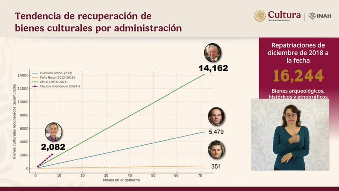 ⇒ Con ello, se consolida la tendencia del Gobierno mexicano que comenzó en la administración de Andrés Manuel López Obrador, cuando se recuperaron 14 mil 162 piezas, logrando así el rescate de 16 mil 244 bienes culturales.