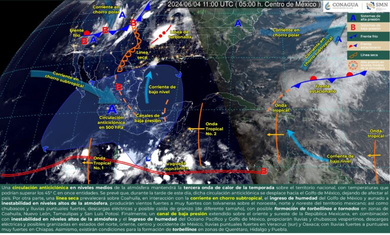 Por otra parte, una línea seca prevalecerá sobre Coahuila, en interacción con la corriente en chorro subtropical, el ingreso de humedad del Golfo de México y aunado a inestabilidad en niveles altos de la atmósfera, producirán vientos fuertes a muy fuertes con tolvaneras sobre el noroeste, norte y noreste del territorio mexicano; así como chubascos y lluvias puntuales fuertes, descargas eléctricas y posible caída de granizo (de diferente tamaño), con posible formación de torbellinos o tornados en zonas de Coahuila, Nuevo León, Tamaulipas y San Luis Potosí.
