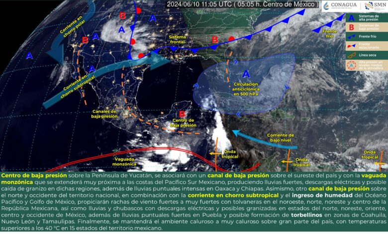 Redacción Xalapa.-Este día, prevalecerá un centro de baja presión sobre la Península de Yucatán, se asociará con un canal de baja presión sobre el sureste del país y con la vaguada monzónica que se extenderá muy próxima a las costas del Pacífico Sur Mexicano, produciendo lluvias fuertes, descargas eléctricas y posible caída de granizo en dichas regiones, además de lluvias puntuales intensas en Oaxaca y Chiapas.