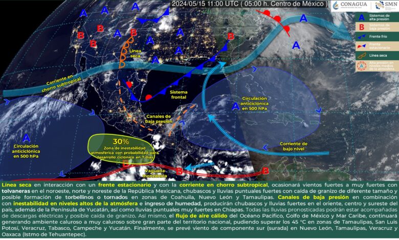 Por otra parte, una línea seca sobre el norte y noreste de México en interacción con un frente estacionario en el noreste país y con la corriente en chorro subtropical, ocasionará rachas de vientos fuertes a muy fuertes con tolvaneras en dichas regiones, chubascos y lluvias fuertes con caída de granizo de diferente tamaño y posible formación de torbellinos o tornados en Coahuila, Nuevo León y Tamaulipas.