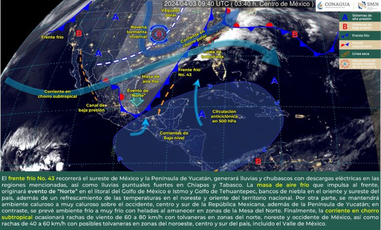 La masa de aire frío que impulsa al frente, originará evento de “Norte” en el litoral del Golfo de México e Istmo y Golfo de Tehuantepec, bancos de niebla en el oriente y sureste del país, además de un refrescamiento de las temperaturas en el noreste y oriente del territorio nacional.