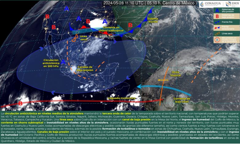 Por otra parte, una línea seca sobre Coahuila en interacción con un canal de baja presión en la Mesa del Norte, con el ingreso de humedad del Golfo de México, con la corriente en chorro subtropical e inestabilidad en niveles altos de la atmósfera, ocasionarán lluvias puntuales fuertes en el norte y noreste del territorio, con lluvias puntuales muy fuertes en Coahuila y Nuevo León, todas acompañadas de descargas eléctricas y posible caída de granizo (de diferente tamaño), así como vientos fuertes a muy fuertes con tolvaneras en el noroeste, norte, noreste, oriente y occidente de México, además de la posible formación de torbellinos o tornados en zonas de Chihuahua, Coahuila, Nuevo León, Tamaulipas, Durango, Zacatecas y Aguascalientes.